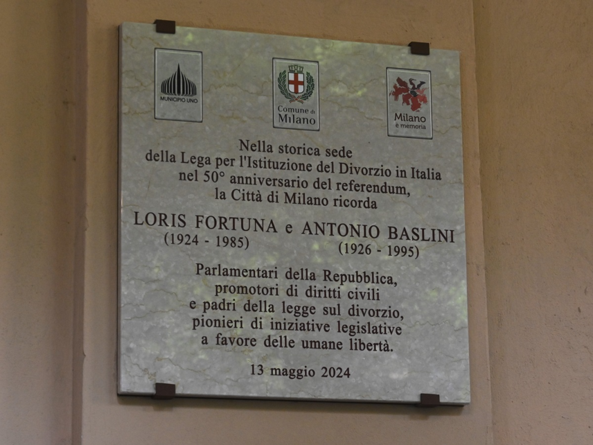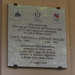 “Parlamentari della Repubblica, promotori di diritti civili e padri della legge sul divorzio, pionieri di iniziative legislative a favore delle umane libertà”. È l’iscrizione incisa sulla targa in memoria di Loris Fortuna e Antonio Baslini, voluta dall’Amministrazione comunale e scoperta oggi in corso di Porta Vigentina 15, in occasione del cinquantesimo anniversario del referendum abrogativo della legge sul divorzio.