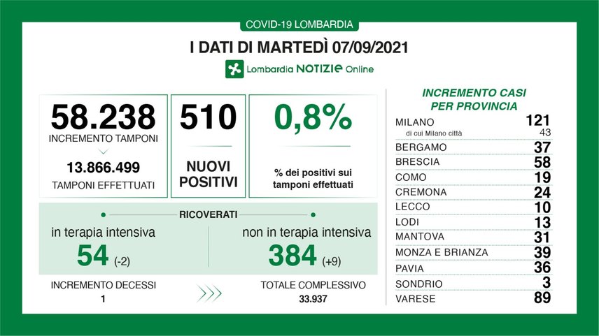 (-2). A fronte di 58.238 tamponi effettuati, sono 510 i nuovi positivi (0,8%).
