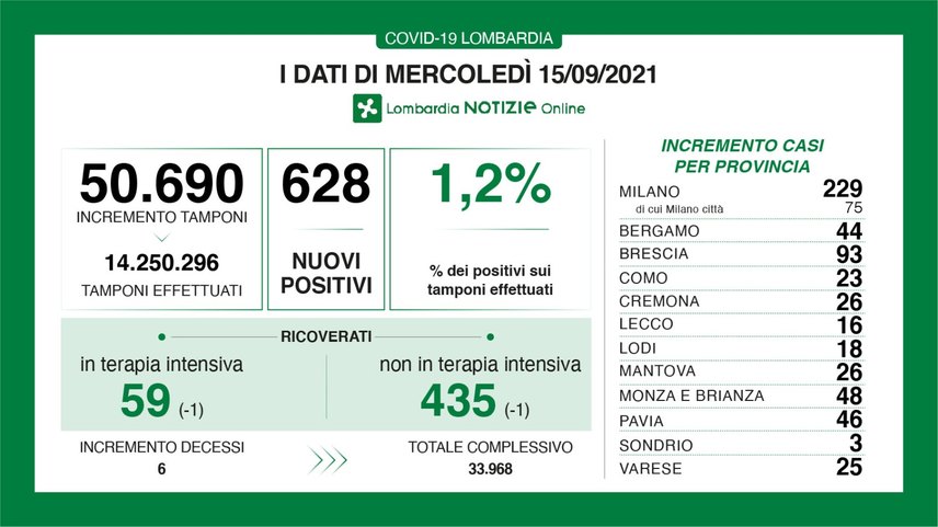 reparti (-1). A fronte di 50.690 tamponi effettuati, sono 628 i nuovi positivi