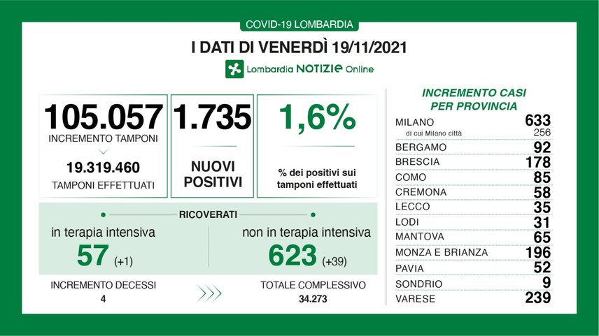 A fronte di 105.057 tamponi effettuati, sono 1.735 i nuovi